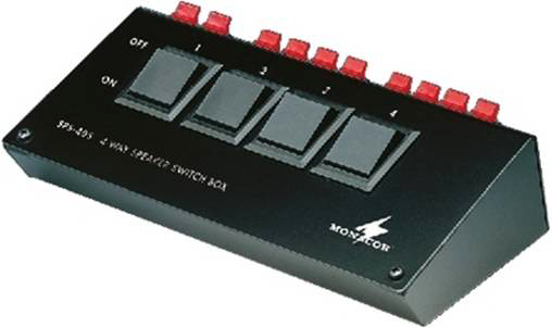 Caja de conmutación para conectar hasta 4 parejas de recintos (4-8 Ω) a un amplificador estéreo. Con resistencias de protección integradas (impedancia mínima 4 Ω). Potencia 200 WMAX, dimensiones: 176x50x100 mm.