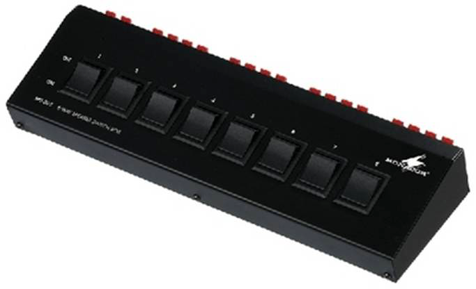 Caja de conmutación para conectar hasta 8 parejas de recintos (4-8 Ω) a una salida de un amplificador estéreo. Con resistencias de protección integradas. Potencia global 300 WMAX, dimensiones: 310x60x115 mm.